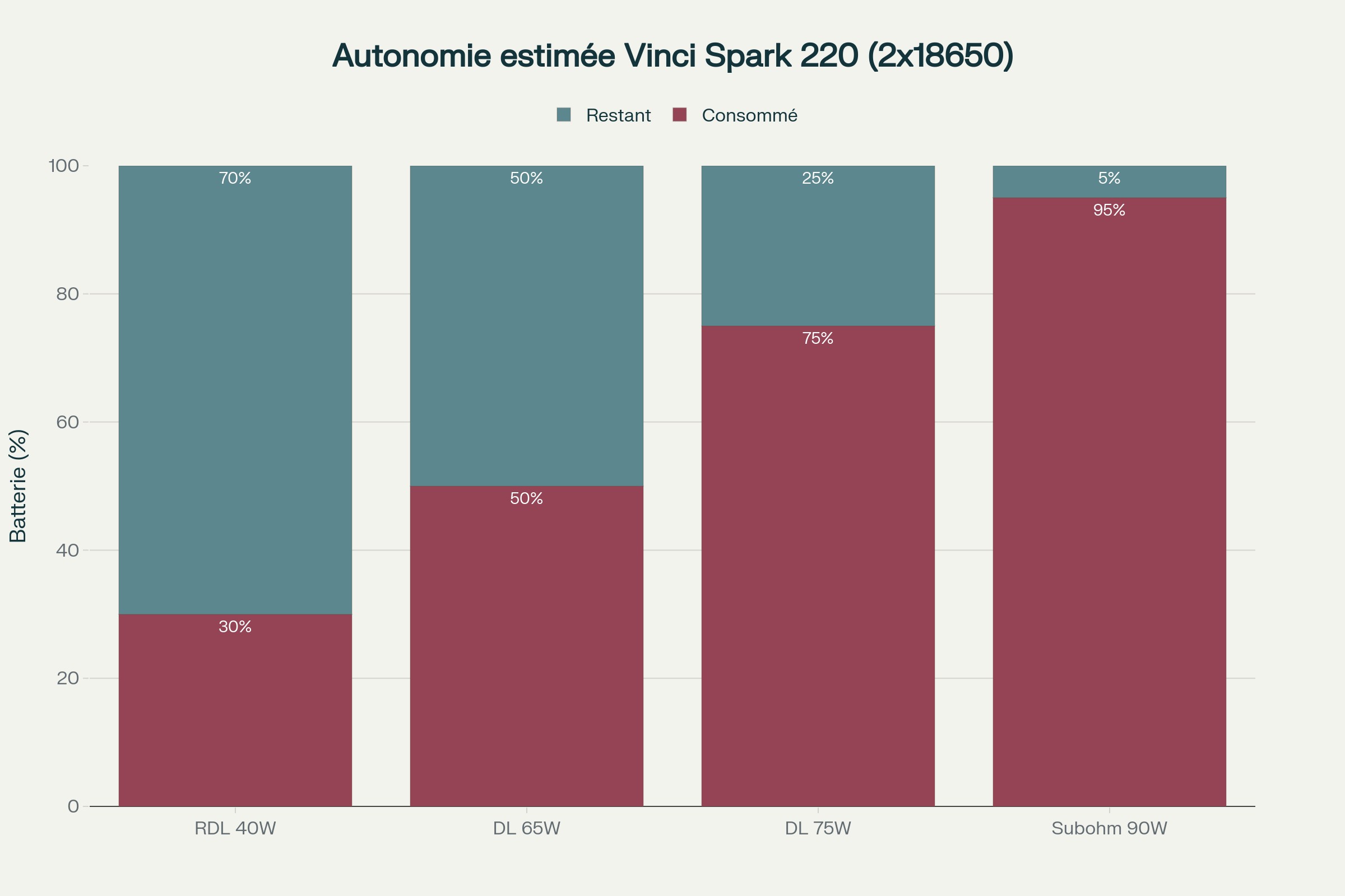 Avec deux accus 18650 (capacité totale d’environ 6000mAh avec des Sony VTC6 3000mAh), l’autonomie du Vinci Spark 220 est très confortable: