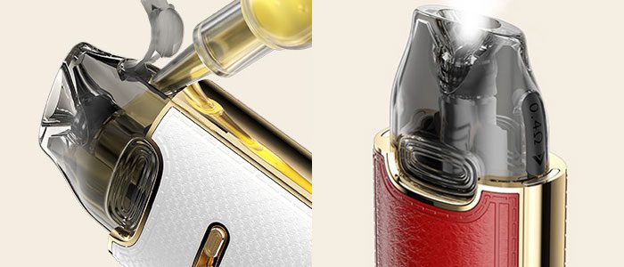 - Remplissez la cartouche en soulevant le capuchon supérieur et en versant l’e-liquide.